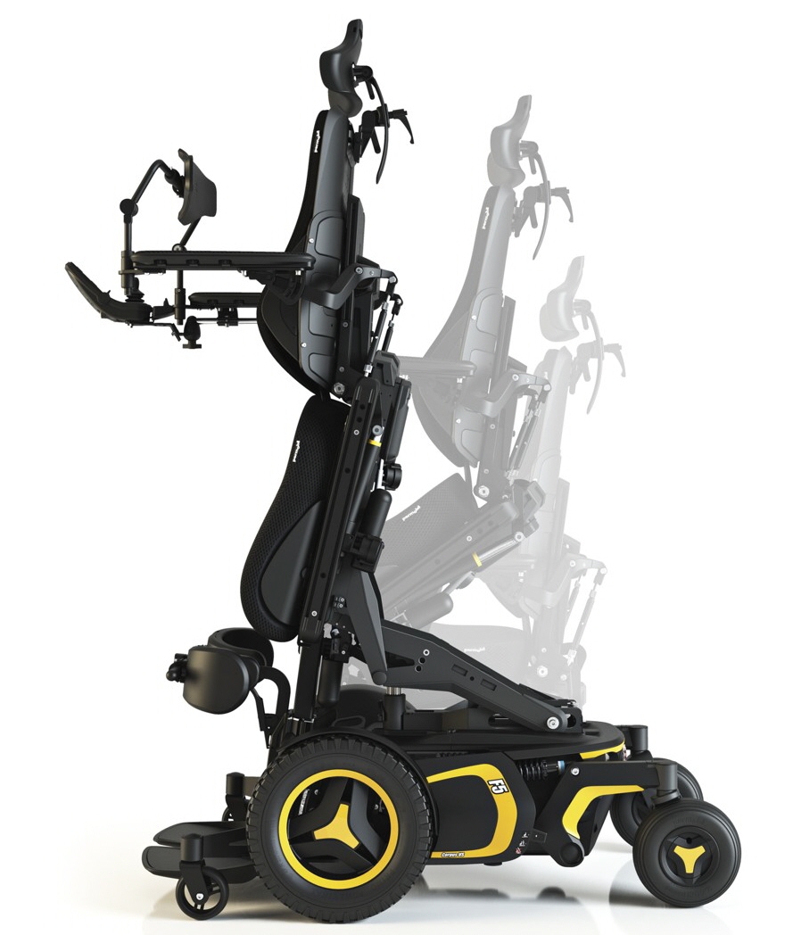 - Standing mode: This is what makes the Permobil F5 VS the Cadillac of the power wheelchair world (I guess that’s a pretty outdated term for high quality, isn’t it?). My iBOT elevates me up on two wheels. My Invacare could elevate me 8 inches. My new chair elevates me, but if I prefer, it also stands me up. I put a padded bar just below my knees and another one across my chest, push a button, and I am standing. It’s a good position to be in for so many activities, but most importantly, by standing a little bit each day, I improve my health—circulation, respiration, digestion, joint health. Standing brings a whole new benefit to physical therapy. Doing my exercises in a standing position allows so much more range of motion.
