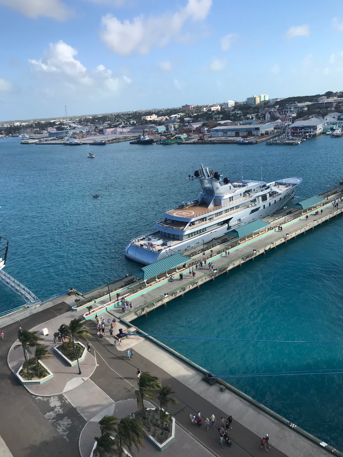 Nassau is more of a traditional port of call. There are lots of local excursions and a busy downtown area within walking distance of the ship. Unfortunately for us, we were one of five major cruise ships to dock in Nassau that day. There must’ve been 16,000 passengers squeezing into the shops, restaurants, and other attractions of Nassau. Somehow, Kim and I found our way to a brewpub that wasn’t too crowded. We downed a couple of beers, walked around the block and decided that our beautiful ship would be a better place to spend the day. On the walk back, we took pictures of this private yacht. Turns out that it’s owned by a Russian oligarch, Leonid Mikhelson, and is valued at approximately $150 million.
